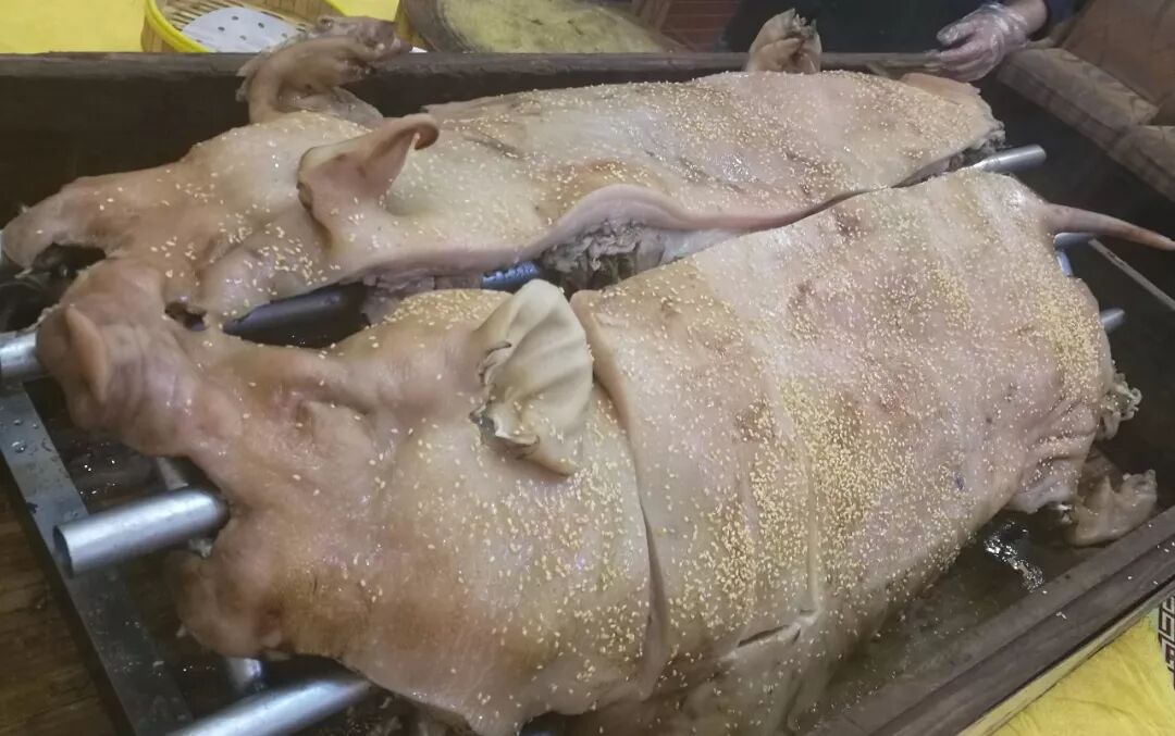 蒸猪出炉了,几位澳美大厨迫不及待,亲自动手,一试刀功。