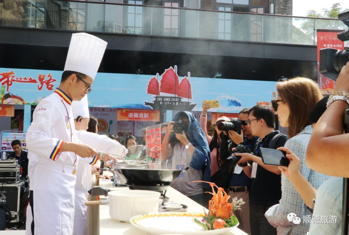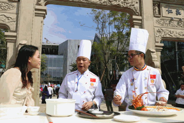 顺德厨师协会会长连庚明、常务副会长兼秘书长王福坚,现场场演示创新的顺德特色菜《龙虾炒牛奶拼凤城野鸡卷》,吸引众多食客近距离观摩。
