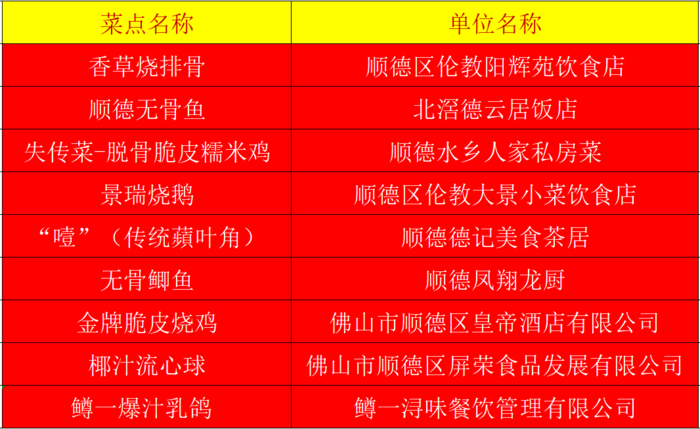 此外,有部份顺德名菜被授予“食在广东”钻石名菜 称号