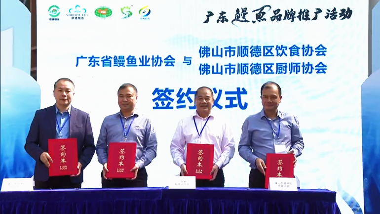 开幕仪式上,广东省鳗鱼业协会和佛山市顺德区饮食协会、佛山市顺德区厨师协会、佛山市顺德区容桂餐饮行业协会、佛山市顺德北滘餐饮业协会、佛山珠江传媒电视有限公司 “鳗鱼文化产业开拓联盟”合作签约,多方强强联手,共同带领鳗鱼产业深入打进餐饮市场,让鳗鱼游向更广阔的空间!